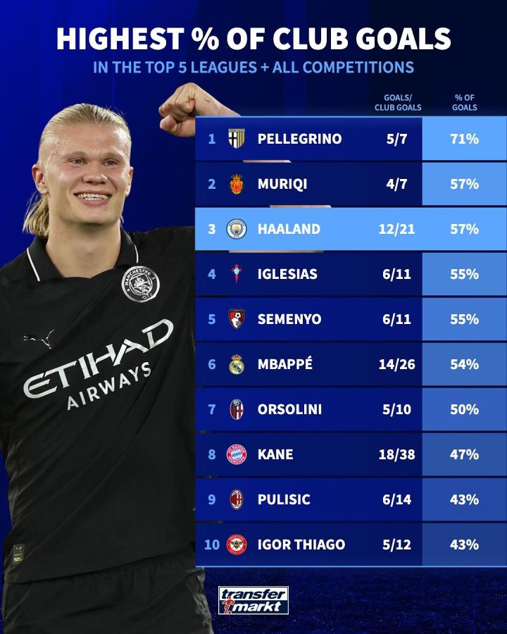 德国转会市场网站为我们揭晓了本赛季五大联赛球员进球数占球队总进球比例的排行榜,其中,打入12球的哈兰德以57%的比例高居第三位!
